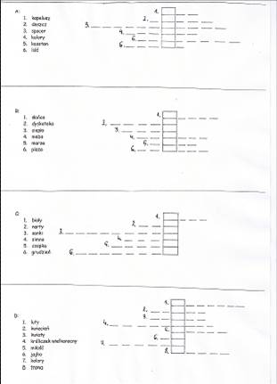 Vorschläge. Dann verteilt die Lehrerin den Schülern die Umschlage mit einer Aufgabe. In jedem Umschlag befindet sich ein Kreuzworträtsel. Die Lösung des Kreuzworträtsels ergibt den Namen einer Jahreszeit. Die Lehrerin überprüft mit den Schülern die Rätseln. Die Schüler zeigen allen die Lösung. Jeder Sch. aus jeder Gruppe sagt etwas über seine Jahreszeit in Plenum (z.ß Assoziationen, Erinnerungen usw.) |